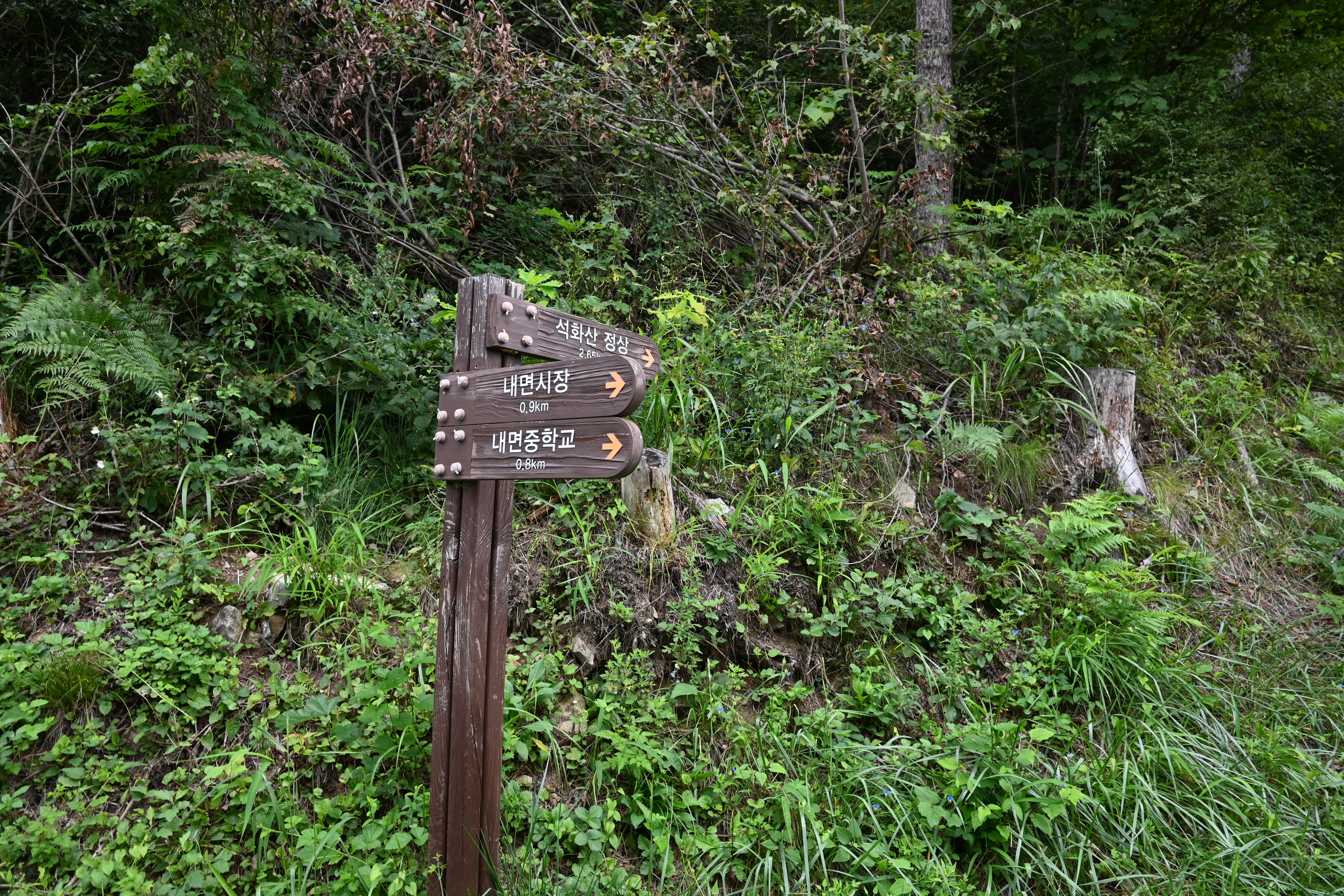석화산 정상에 있는 안내문을 살펴보니, 석화산이 문암산인 모양이다. 율전리 쪽에 문암마을이 있고 문암마을로 내려가는 능선에 문바위가 있으니, 그쪽 마을에서 보면 문암산일 터이고. 창촌리 쪽에서 보면 돌삐에 핀 석이버섯이 석화처럼 보여서 석화산이라고 불렀을 것이다. 정상석이 석화산으로 된 건 내면 면소재지가 창촌리에 있기 때문일 것이다. 내 갠 적인 생각이니까 뭐라고 하지 마라. 어쨌든. 그렇고 그래서. 문암산 이름이 저 쪽에 있는 제일 높은 봉우리로 이사를 갔는 모양이다. 정상석이 있는 봉우리에는 오늘 함께 올라 간 사람들이 먼저 자리를 차지해서 영역표시를 하고 있었다. 비집고 들어갈 틈이 보이지 않았다. 할 수 없이 정상에서 조금 내려갔더니 앉을만한 곳이 있었다. 인스턴트 주먹밥 한 개와 바나나 두 개를 먹었더니 배불렀다.