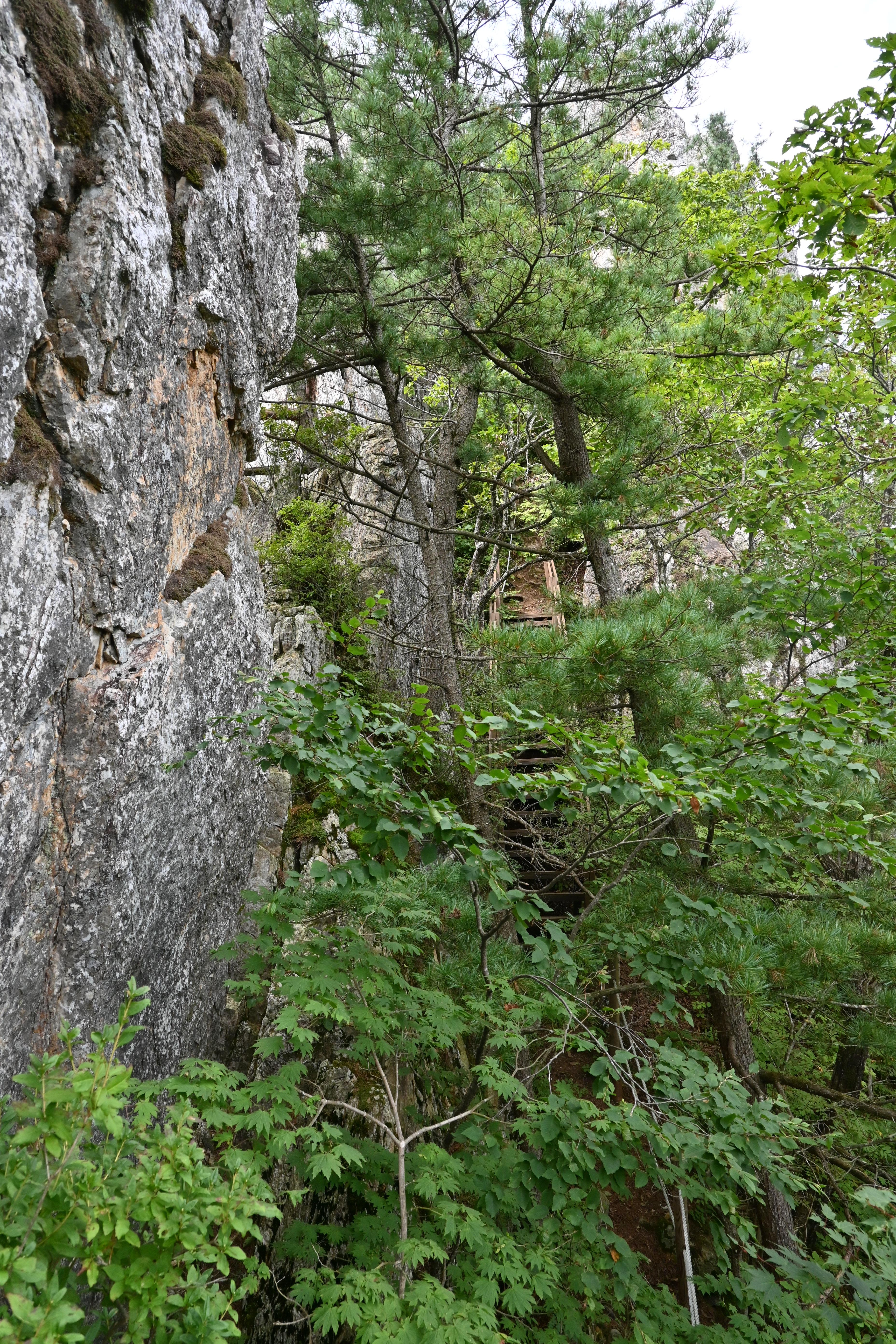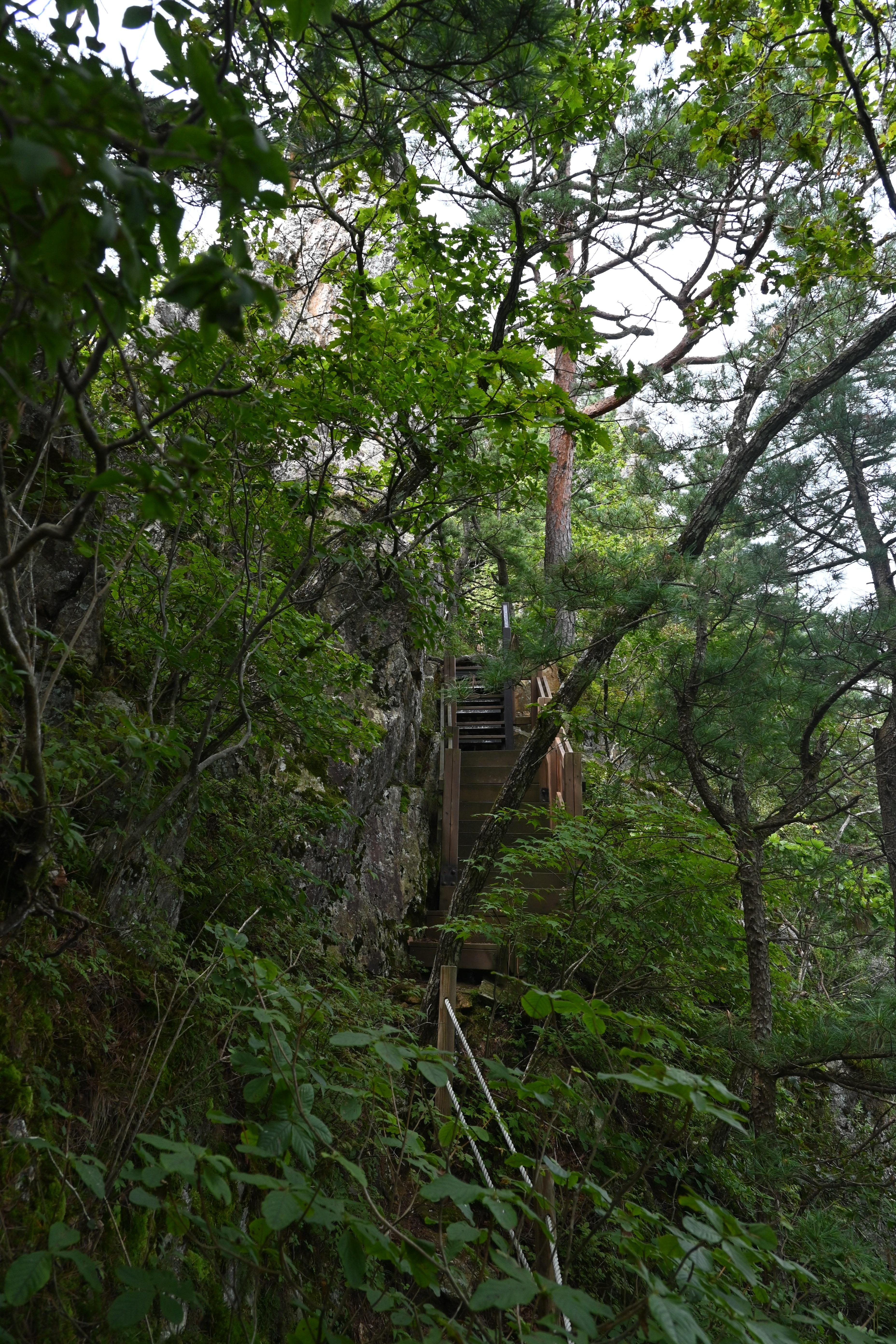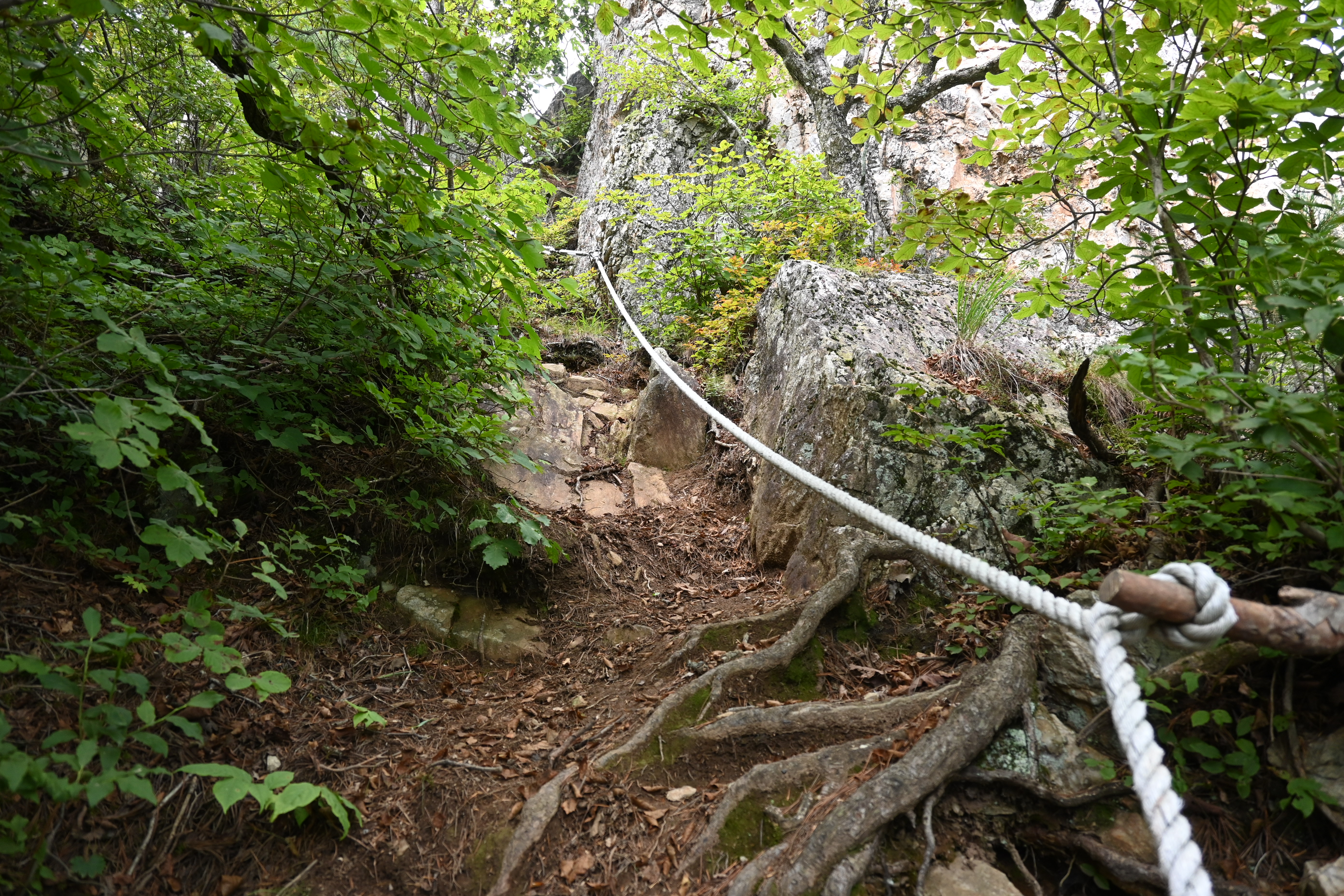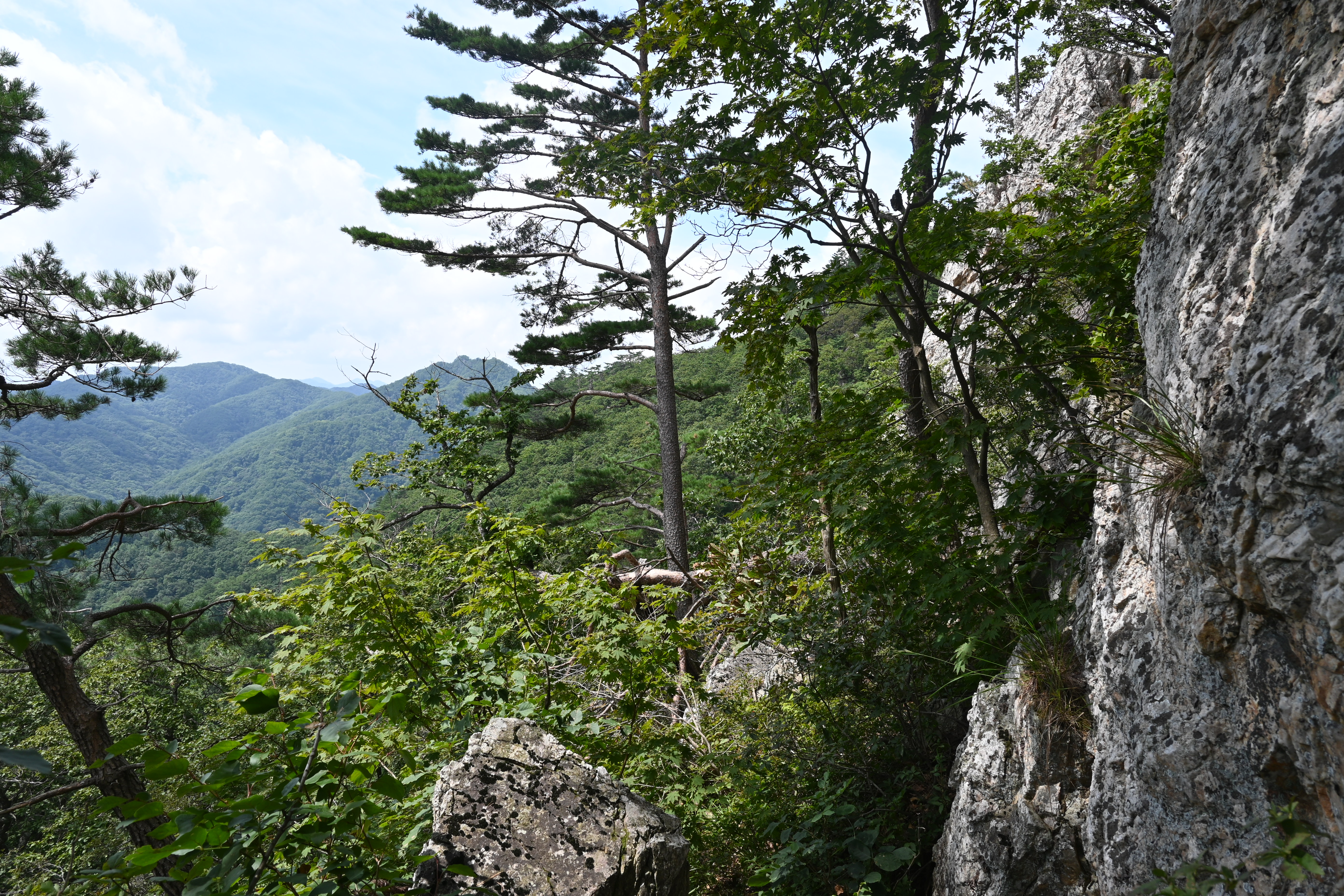 오늘 산행지는 문암산과 석화산이다. 월간산 100대 명산이고, 블랙야크 100+ 산이다. 산악회 공지에 올라온 문암산은 애초에 갈 생각이 없었다. 버스가 창촌 1교에서 B코스를 걸을 사람들을 내려 줬다. 내면성당과 백두대간트레일 안내센터를 지나고도 포장도로를 따라서 한참을 올라갔더니 석화산 올라가는 산길이 열렸다. 산으로 들어서자 갑자기 더워져서 땀이 흘렀다. 덥구먼. 가파른 산길을 걸어서 올라가는 능선길에 이르자 바람이 제법 불어왔다. 벌목지대에 도착했다. 석화산 정상부가 보였고, 왼쪽으로는 탁 트인 조망이 멋졌다. 사진도 찍고 슬금슬금 천천히 걸었다. 다들 그러고 있었다. 바위지대가 나오고 백성동에서 올라오는 길과 만나는 곳부터 산길은 까칠해졌다. 먼저 밧줄구간이 나왔다. 조금 더 올라갔더니 호치키스구간이 나오고 목제계단구간도 나왔다. 이 후로는 그런 시설물들이 교대로 나왔다. 동봉 정상 바로 아래에 있는 조망터로 가봤다. 창촌리 쪽 조망이 매우 좋았다. 산행대장의 요구로 여러 자세로 폼을 잡고 사진을 찍었다. 나중에 사진을 받아 봤더니 인물이 그래서. 영 아니올시다.